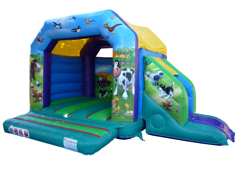 Voici notre Chateauboggan sur le thème des animaux de la ferme! Tout le plaisir d’un château gonflable associé à un toboggan dans l’univers fantastique de la cour de ferme. Ce château est plaît aux filles comme aux garçons. Vos enfants et leurs amis vont adorer sauter par la porte et rebondir à l’intérieur, avant de glisser sur le toboggan. Une sûre valeur pour les fêtes. Vos enfants ne voudront pas quitter ce château! S’intègre parfaitement dans la plupart des jardins, ce château a de superbes reproductions numériques de la ferme, avec un tracteur, chien de berger, des vaches et des chevaux.